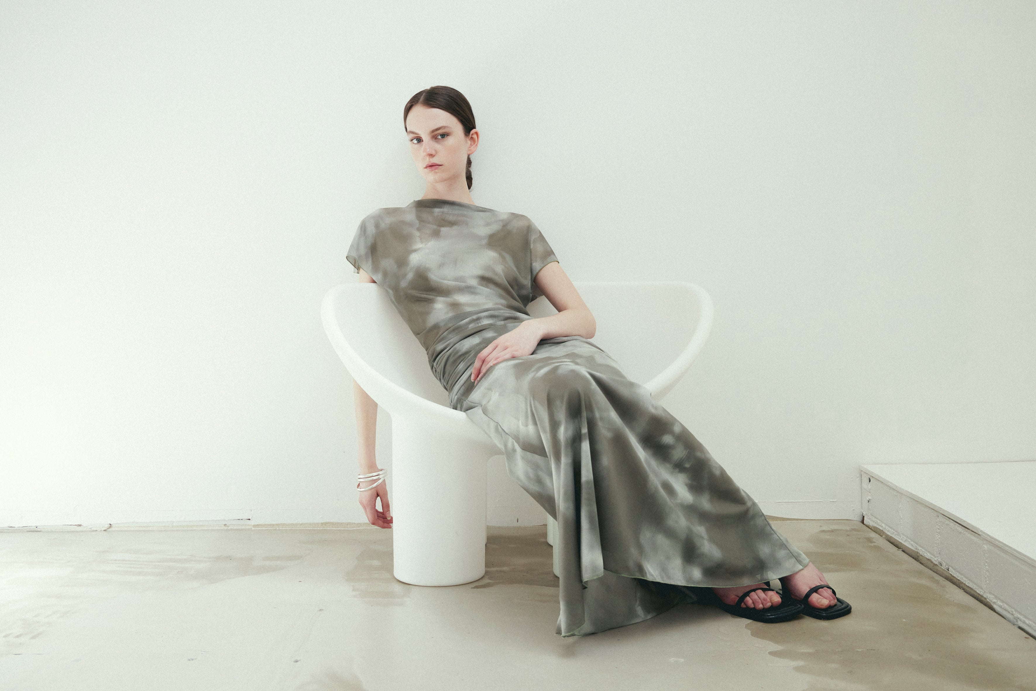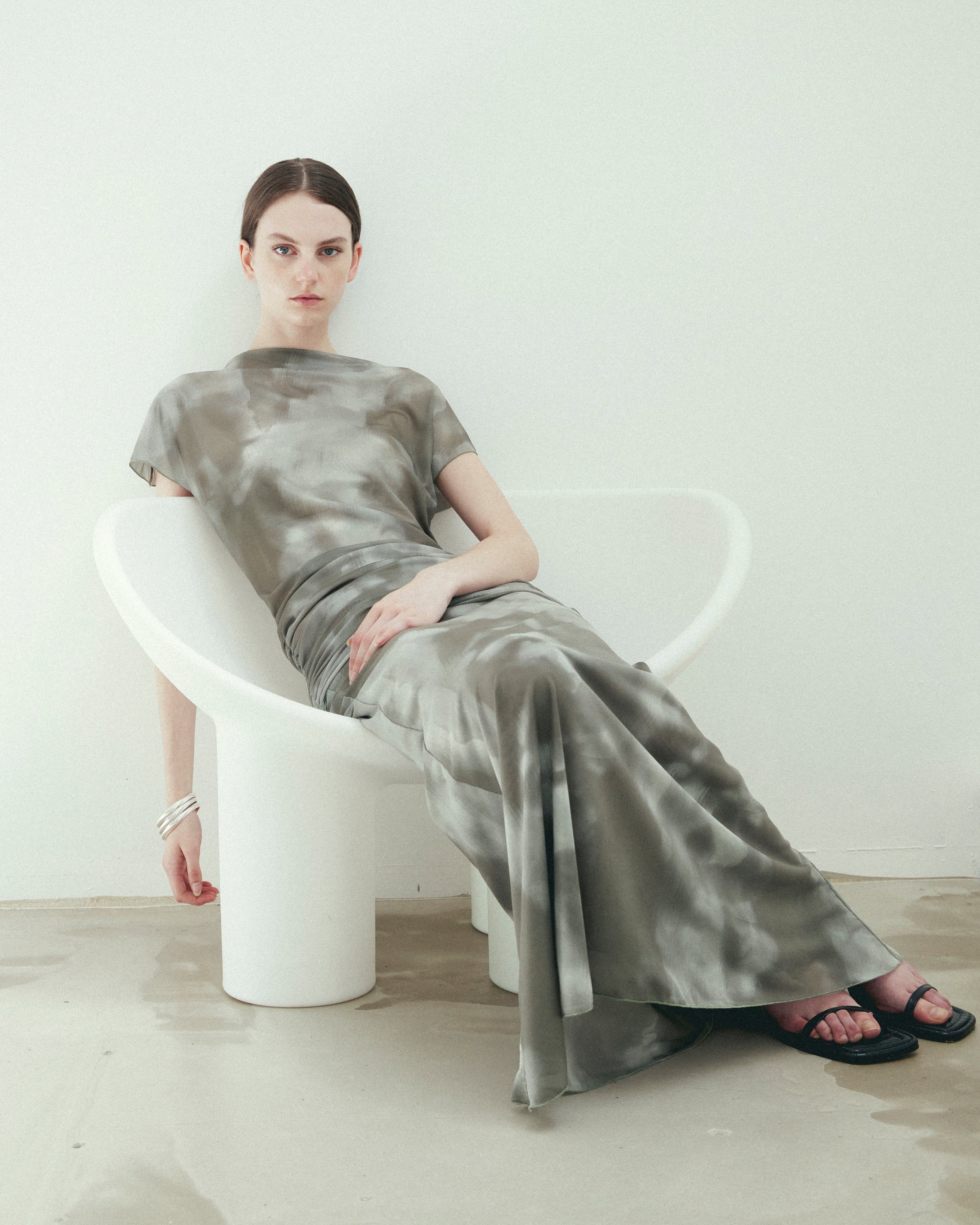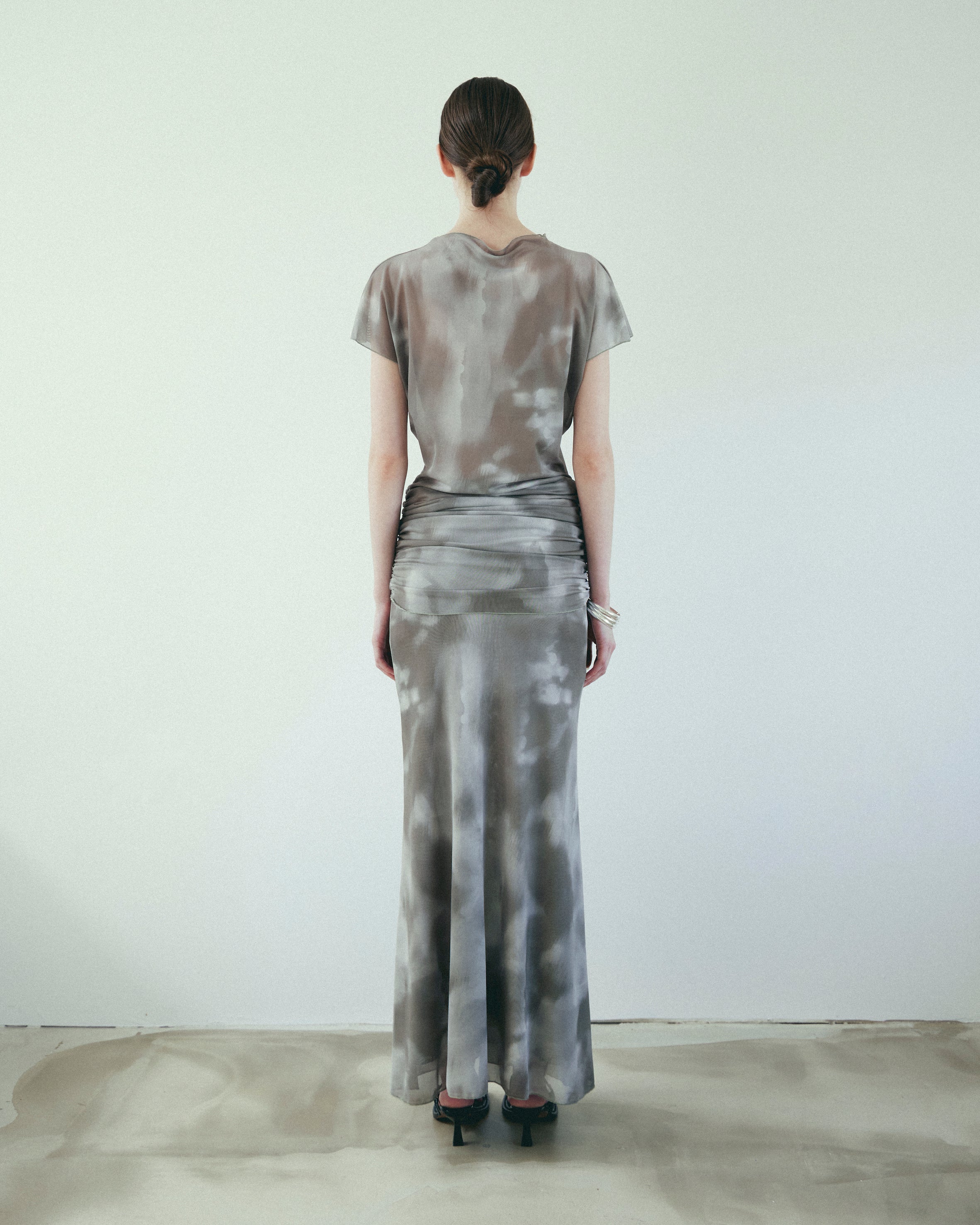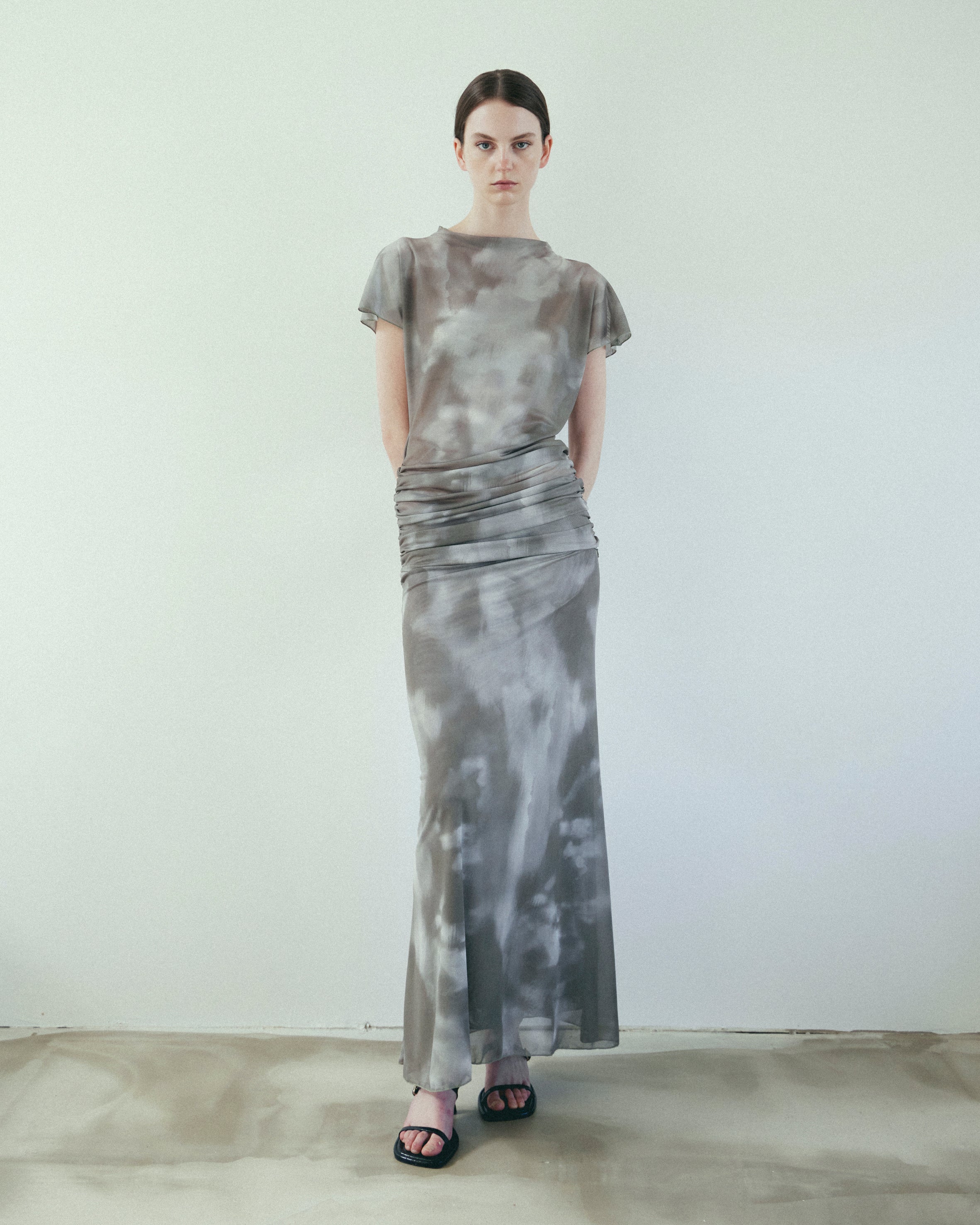 The Top is a loose fitting batwing tee with a soft tube neck and a ruched band at the hem. The ruching allows the top to sit however long or short you choose. The Skirt is a minimalist fitted skirt with a bell hem. It has two layers of mesh and an elasticated waist.