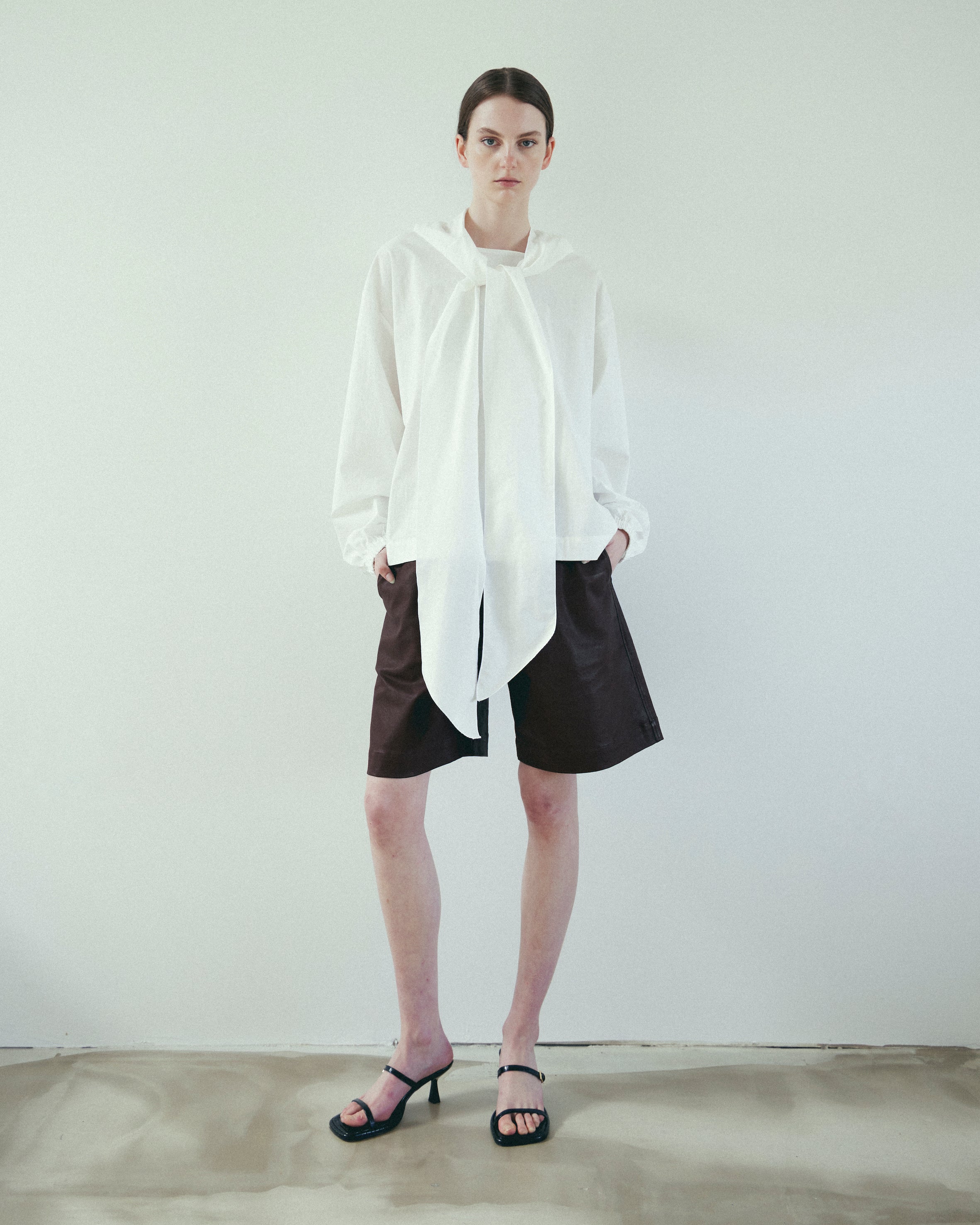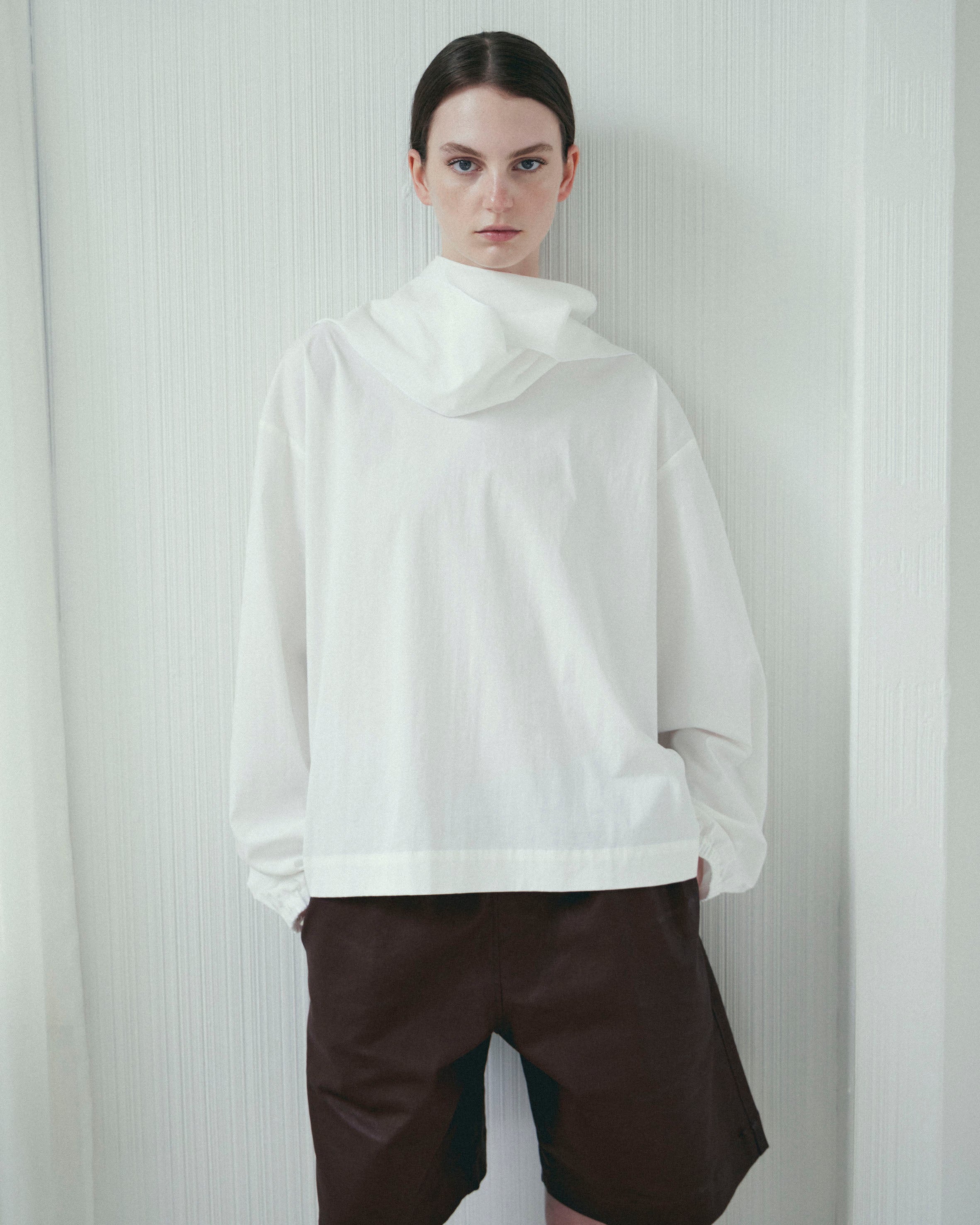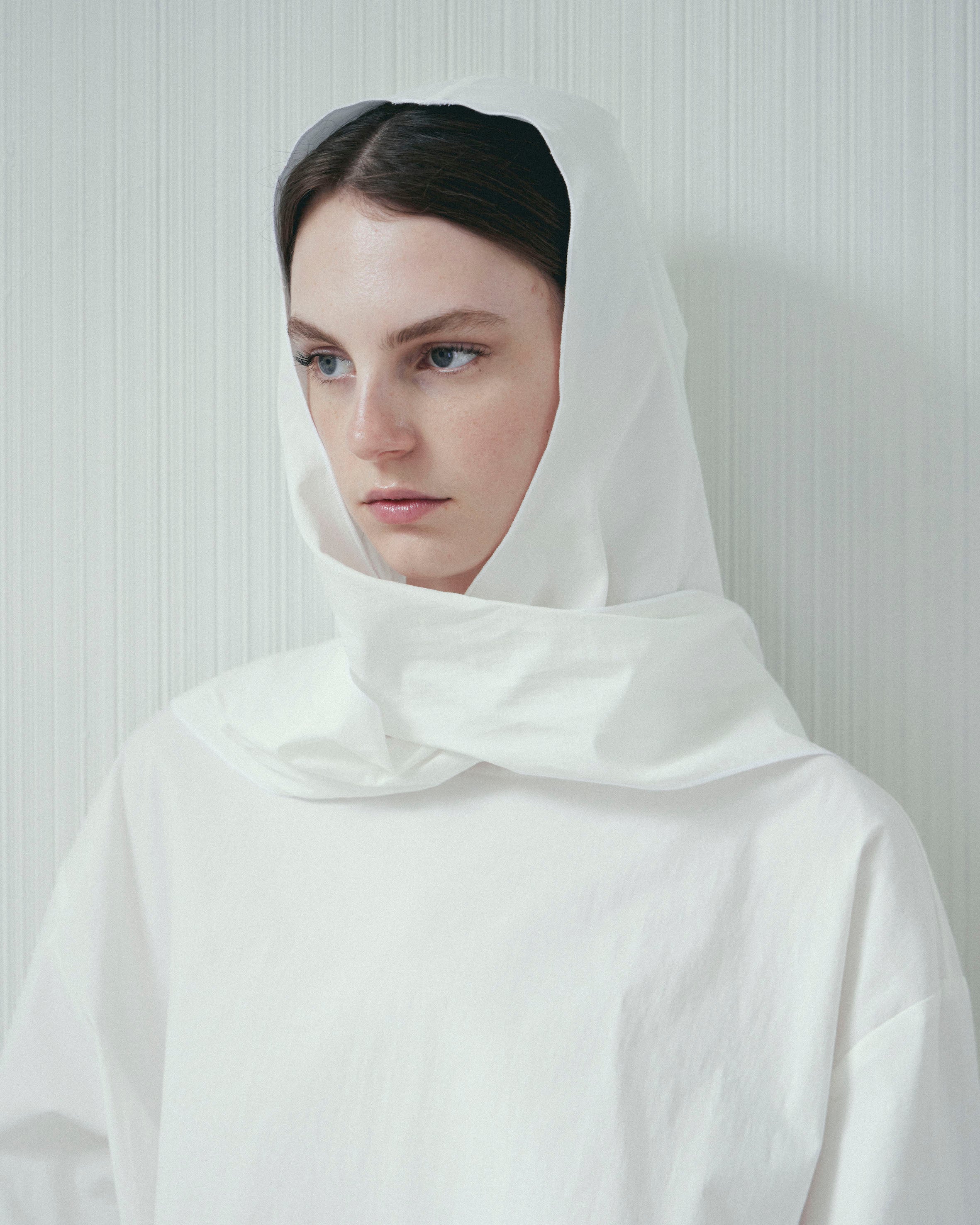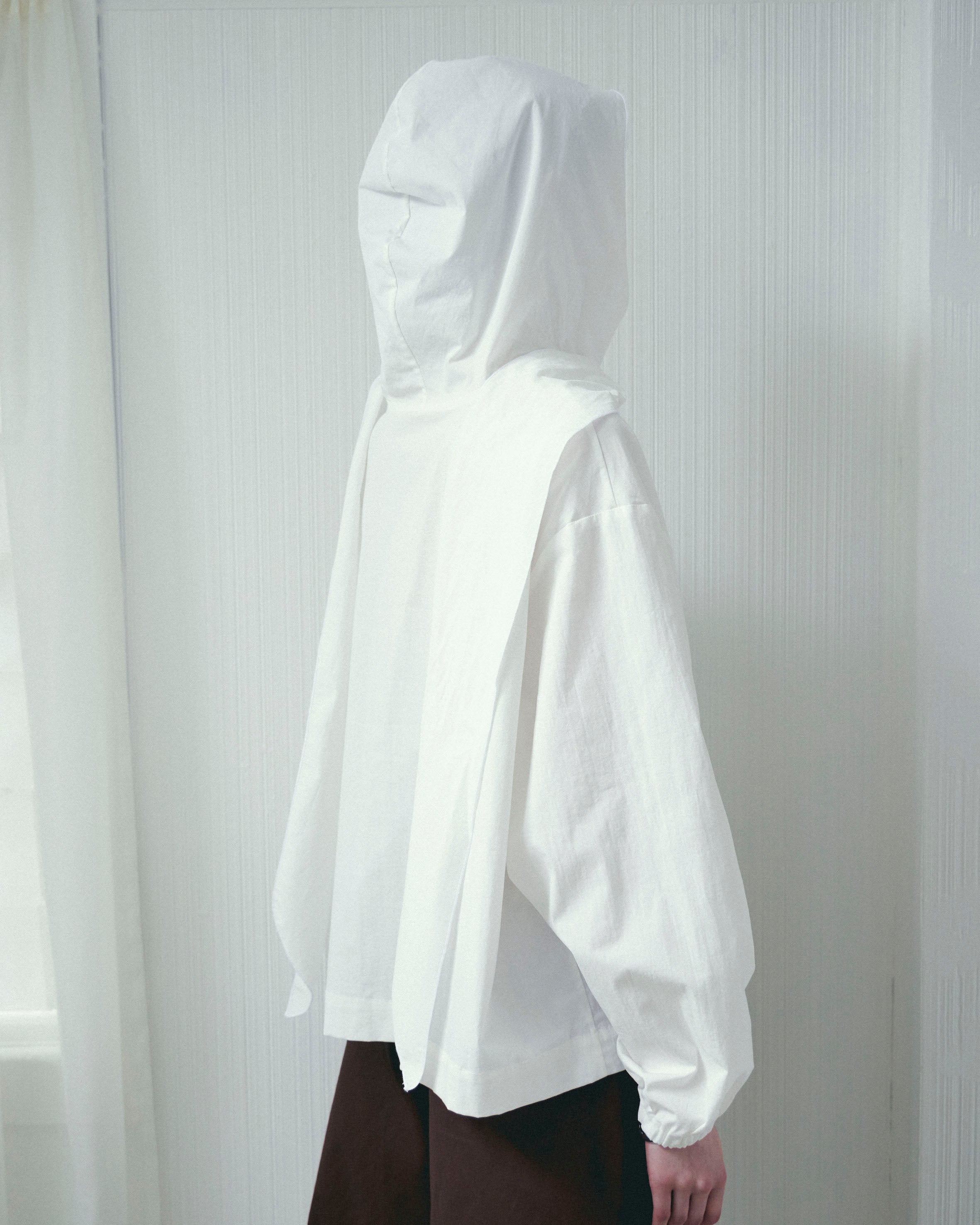 The Swan shirt is an oversized design made from a beautiful crunchy cotton. Part shirt, part hoodie, it features a hood with long scarf like ties to style as you wish. The sleeves have an elasticated hem creating a bubble shape.