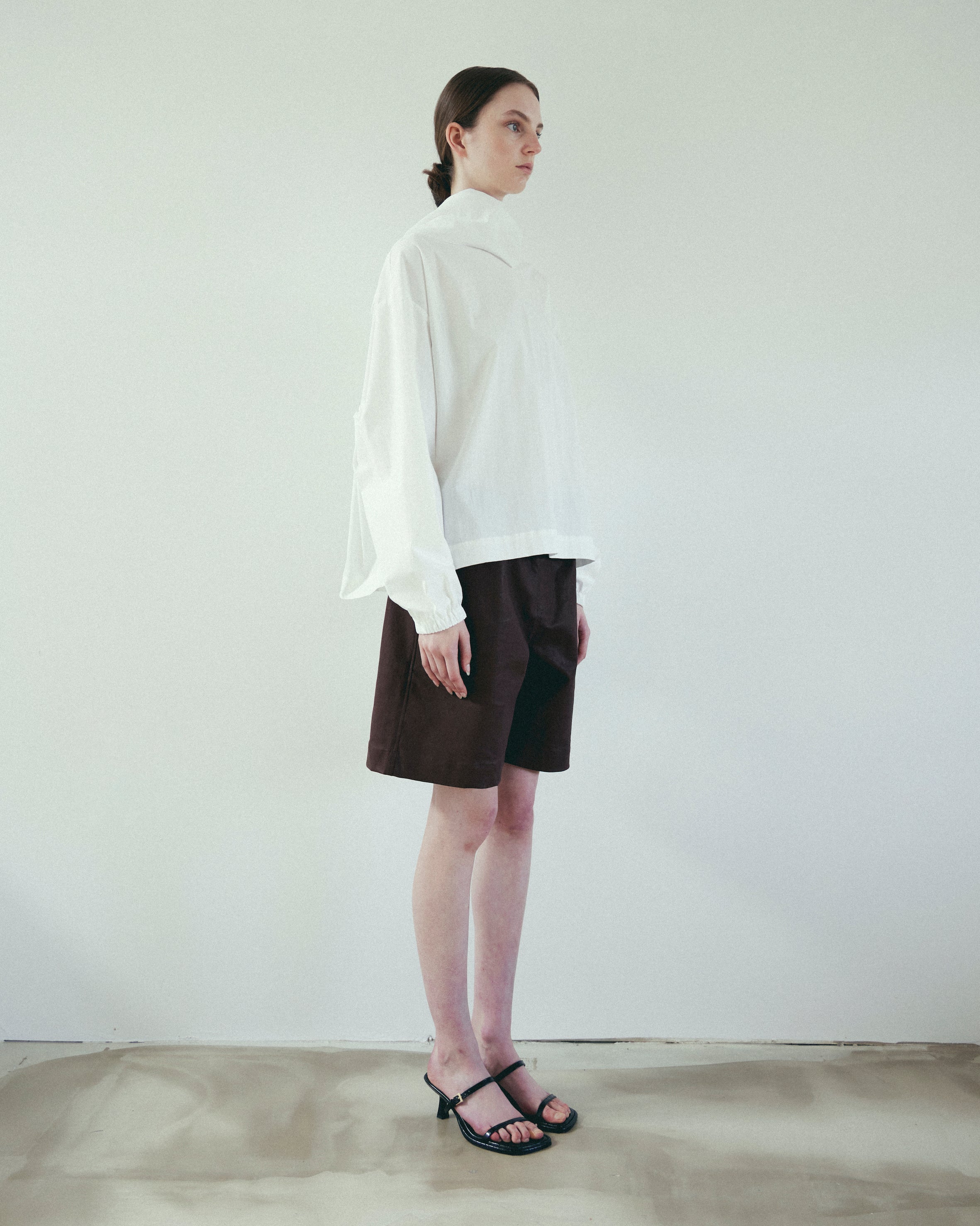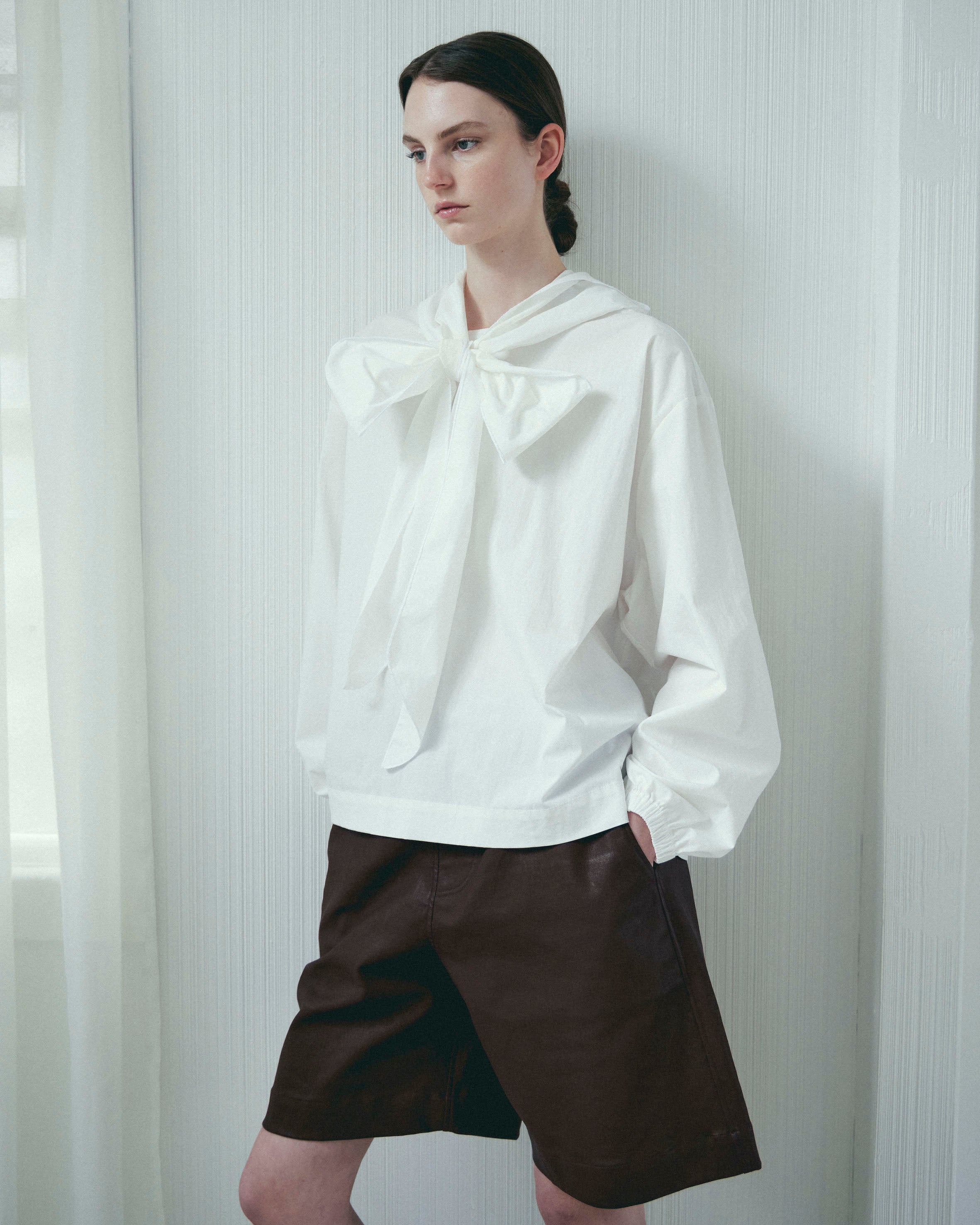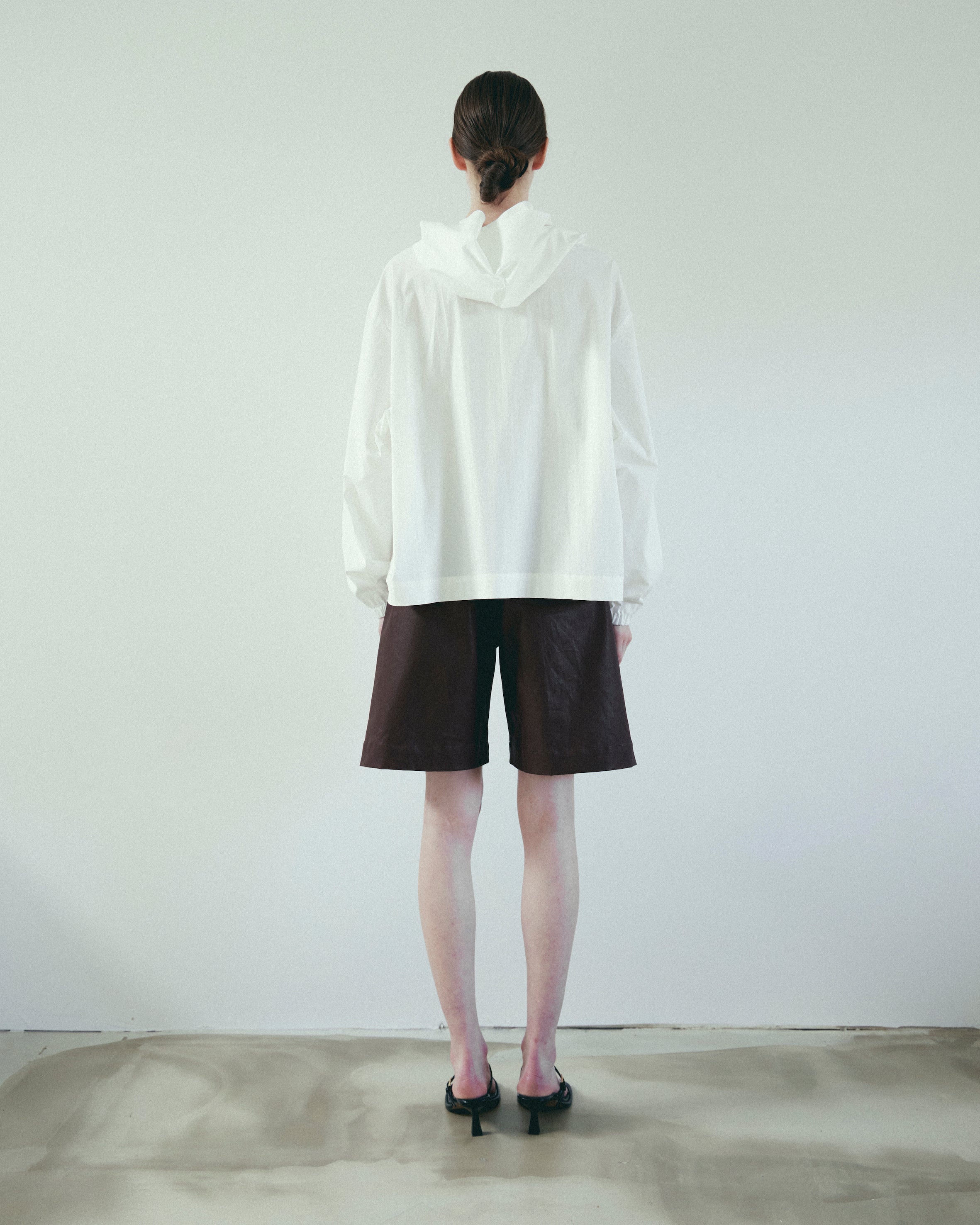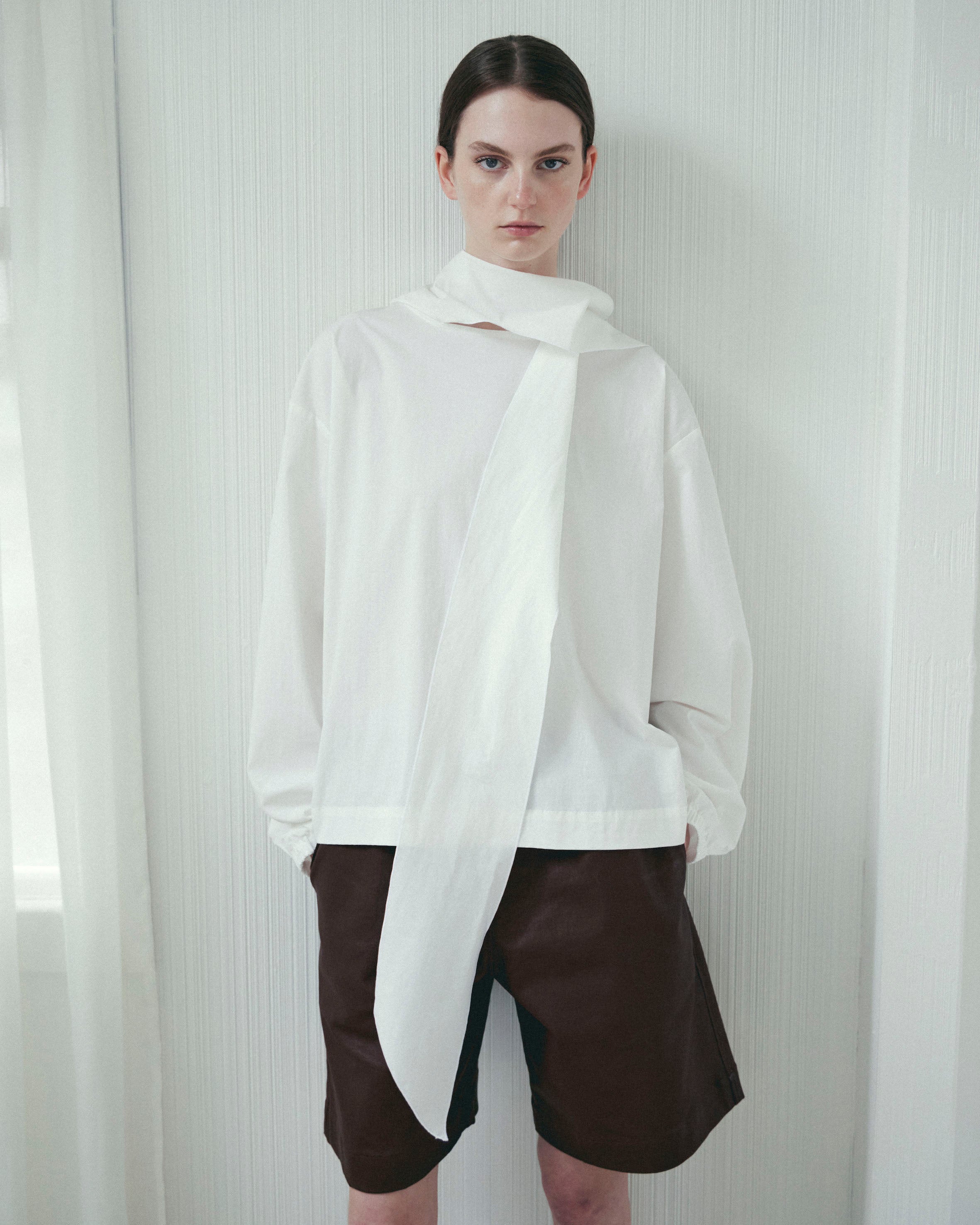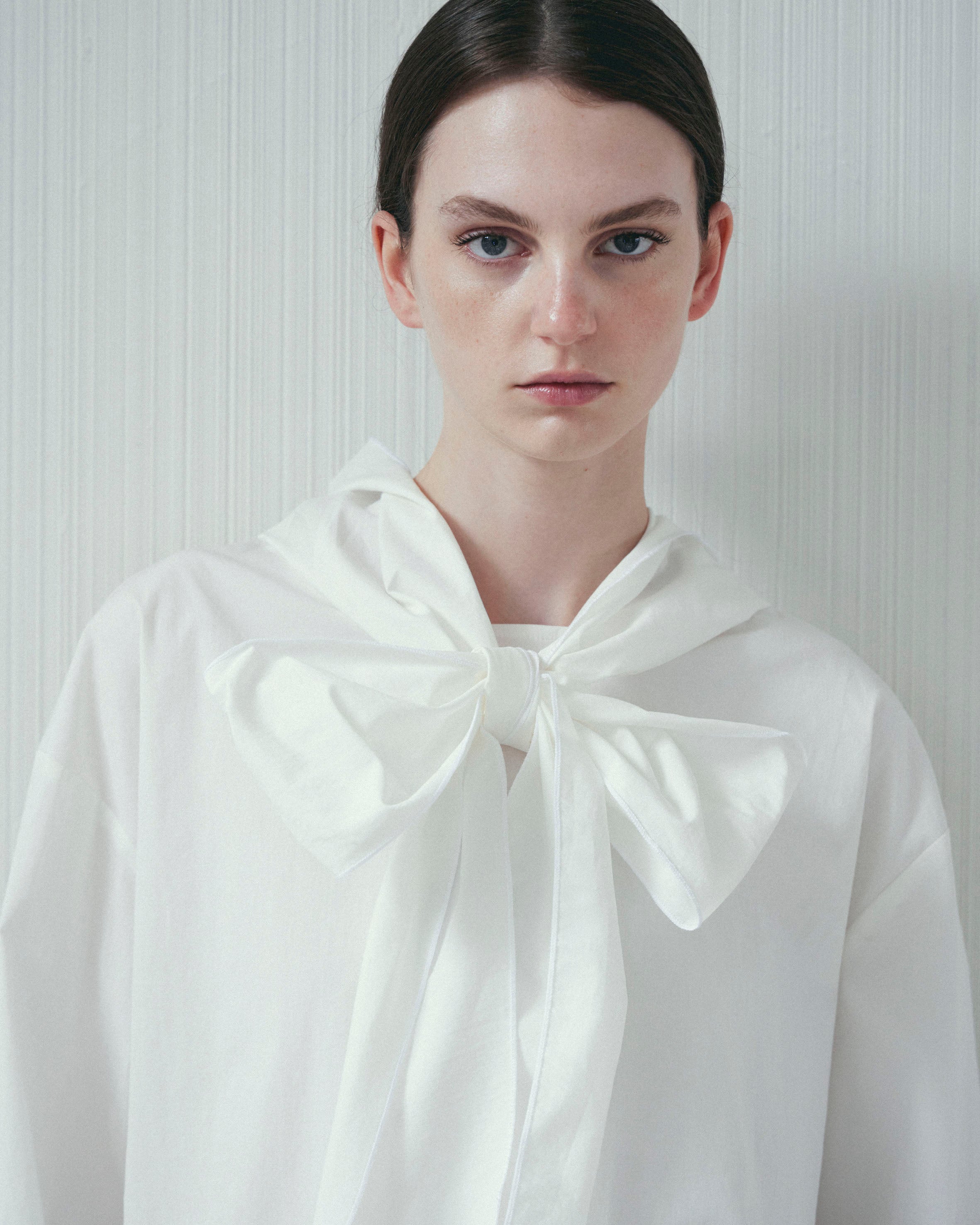 The Swan shirt is an oversized design made from a beautiful crunchy cotton. Part shirt, part hoodie, it features a hood with long scarf like ties to style as you wish. The sleeves have an elasticated hem creating a bubble shape.