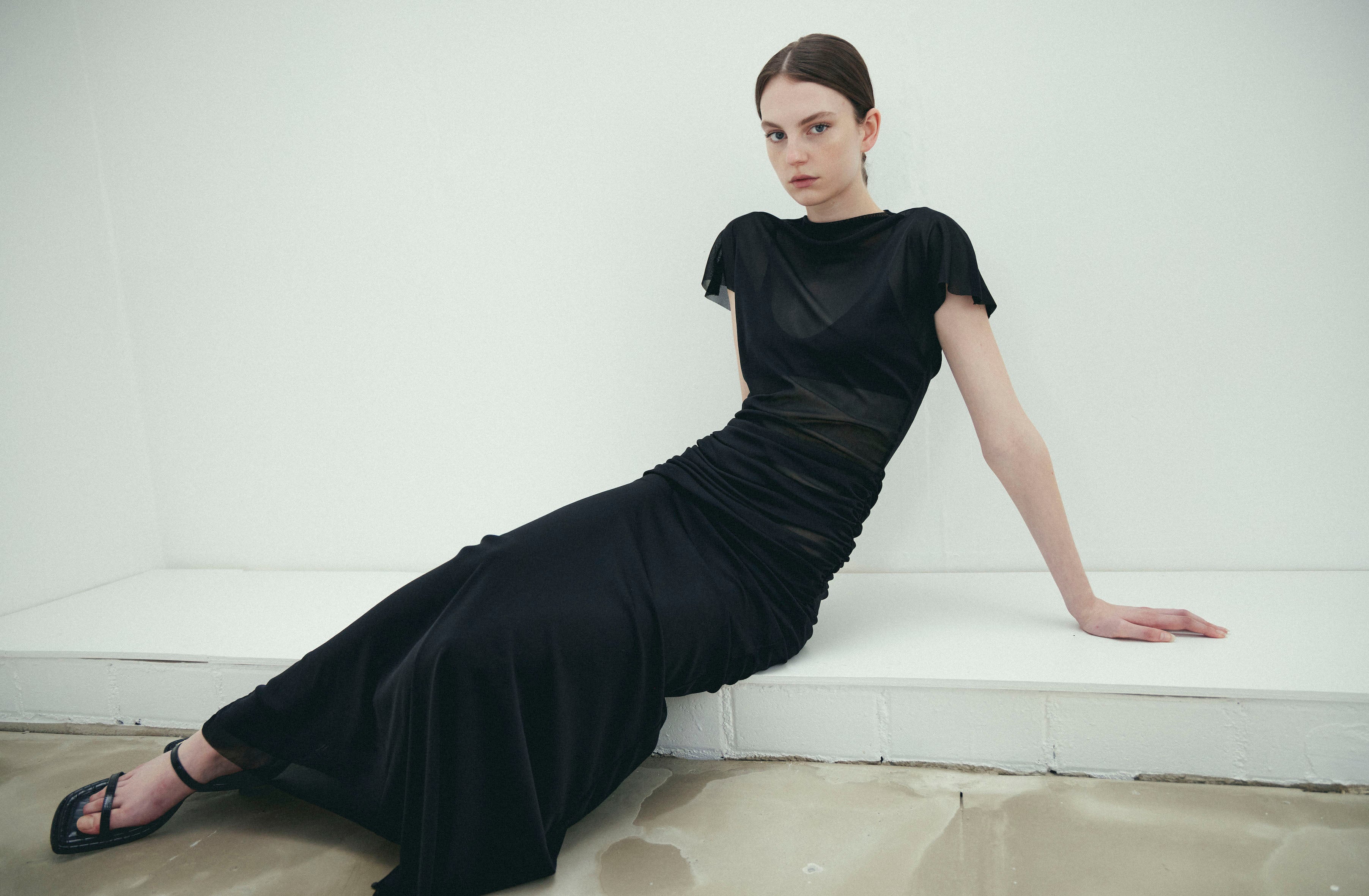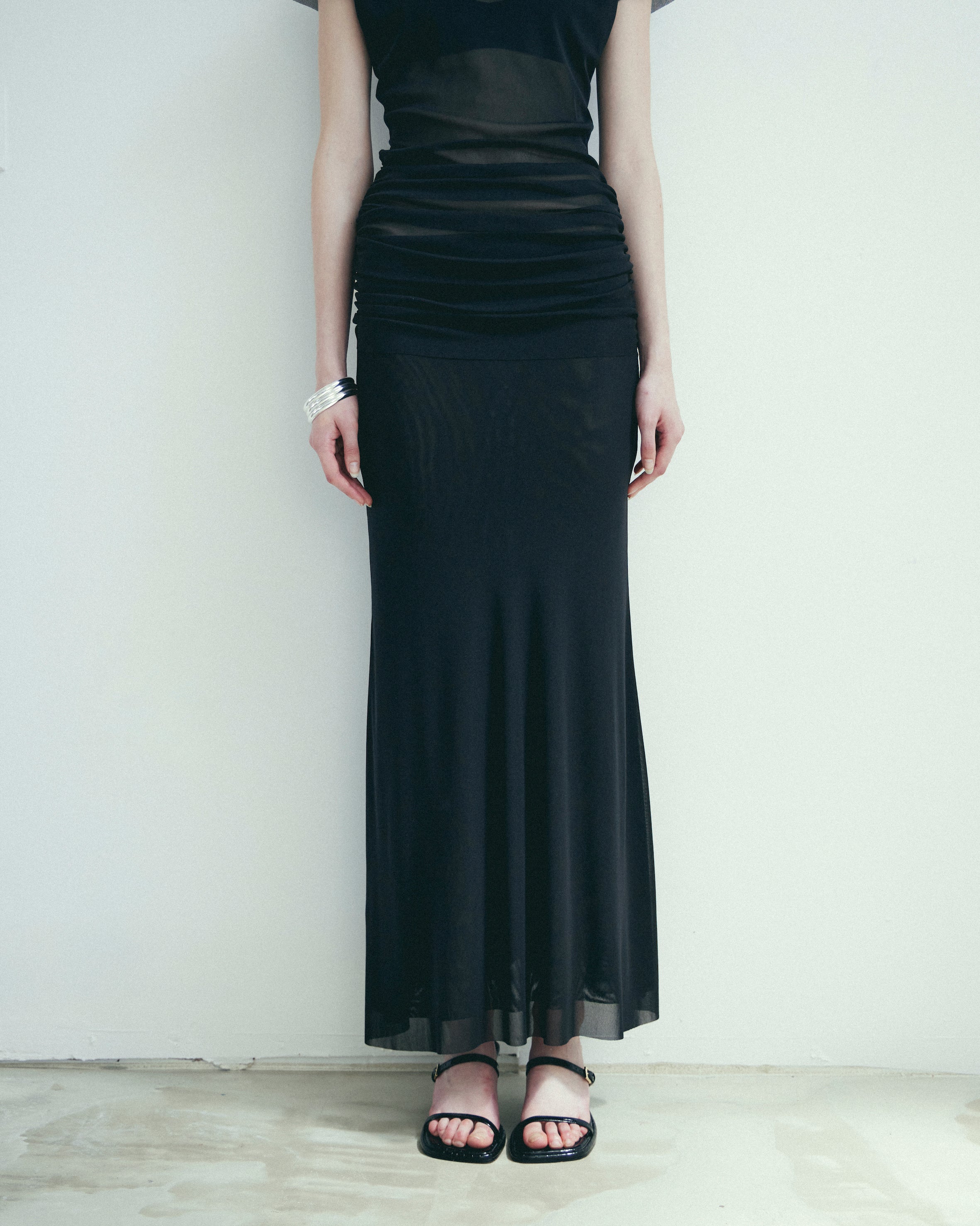 The Dune Skirt is a minimalist fitted skirt with a bell hem. It has two layers of mesh, an elasticated waist and baby locked hems for a minimal finish.