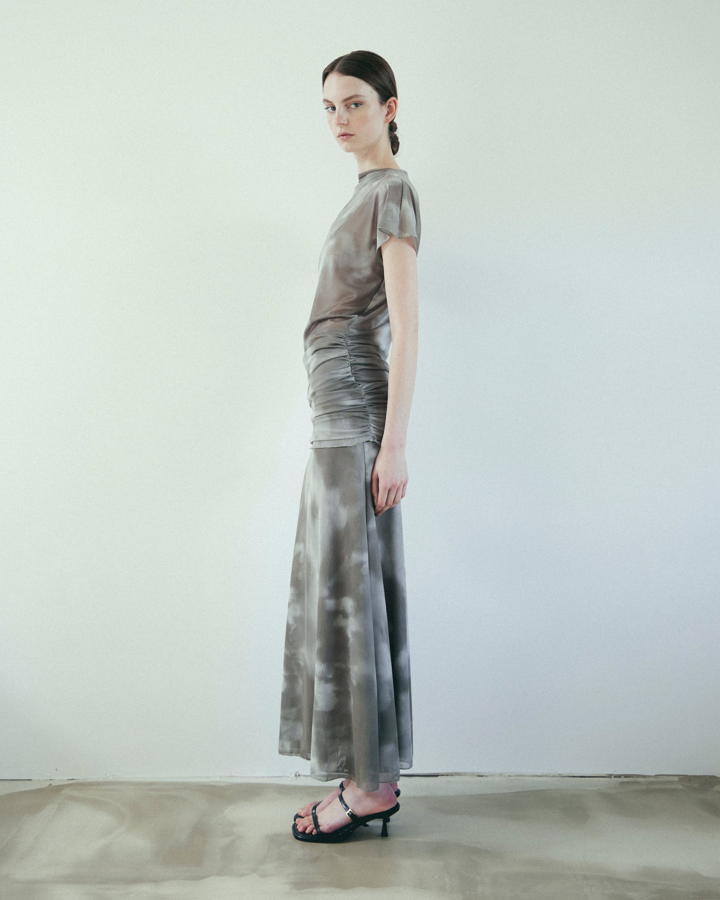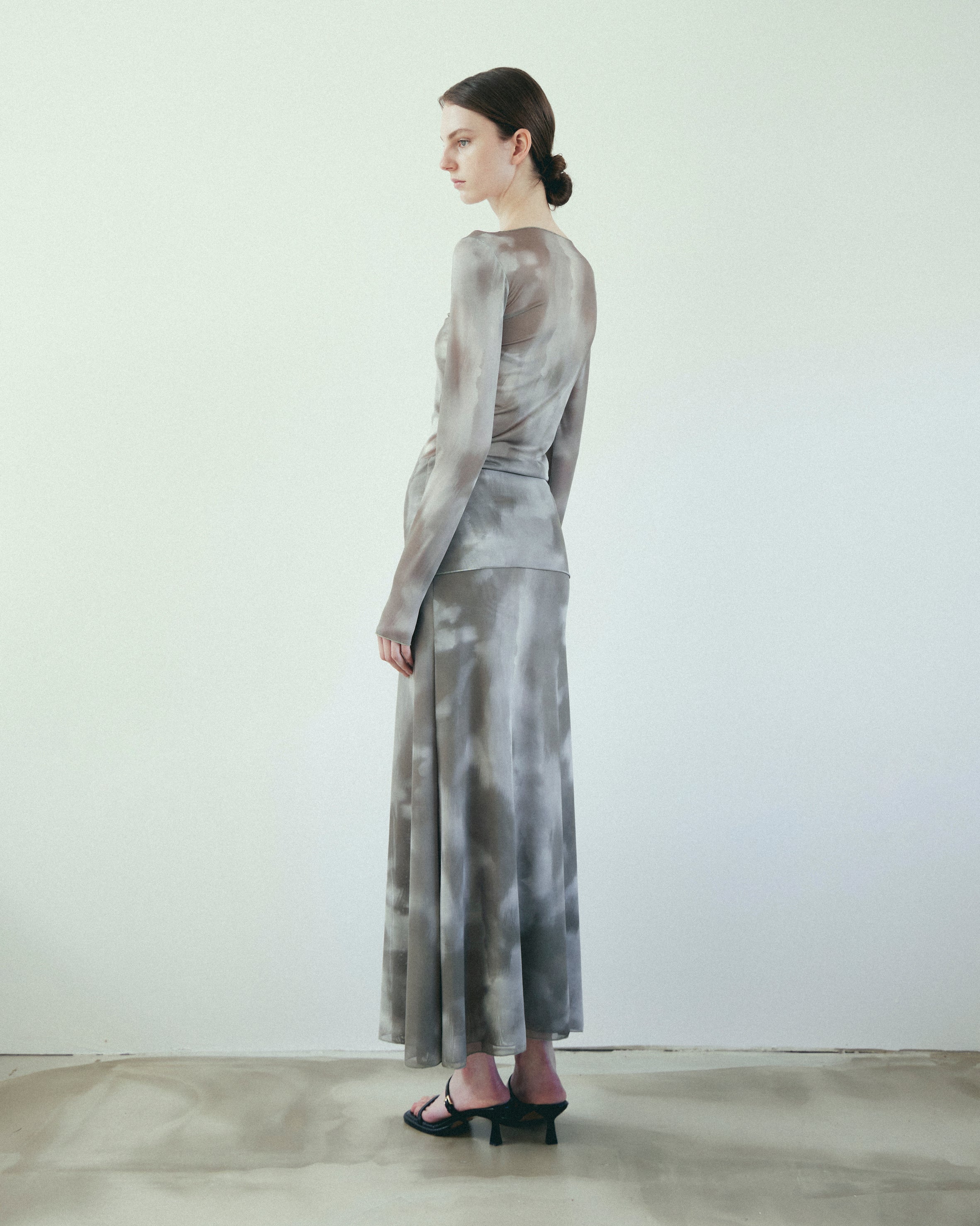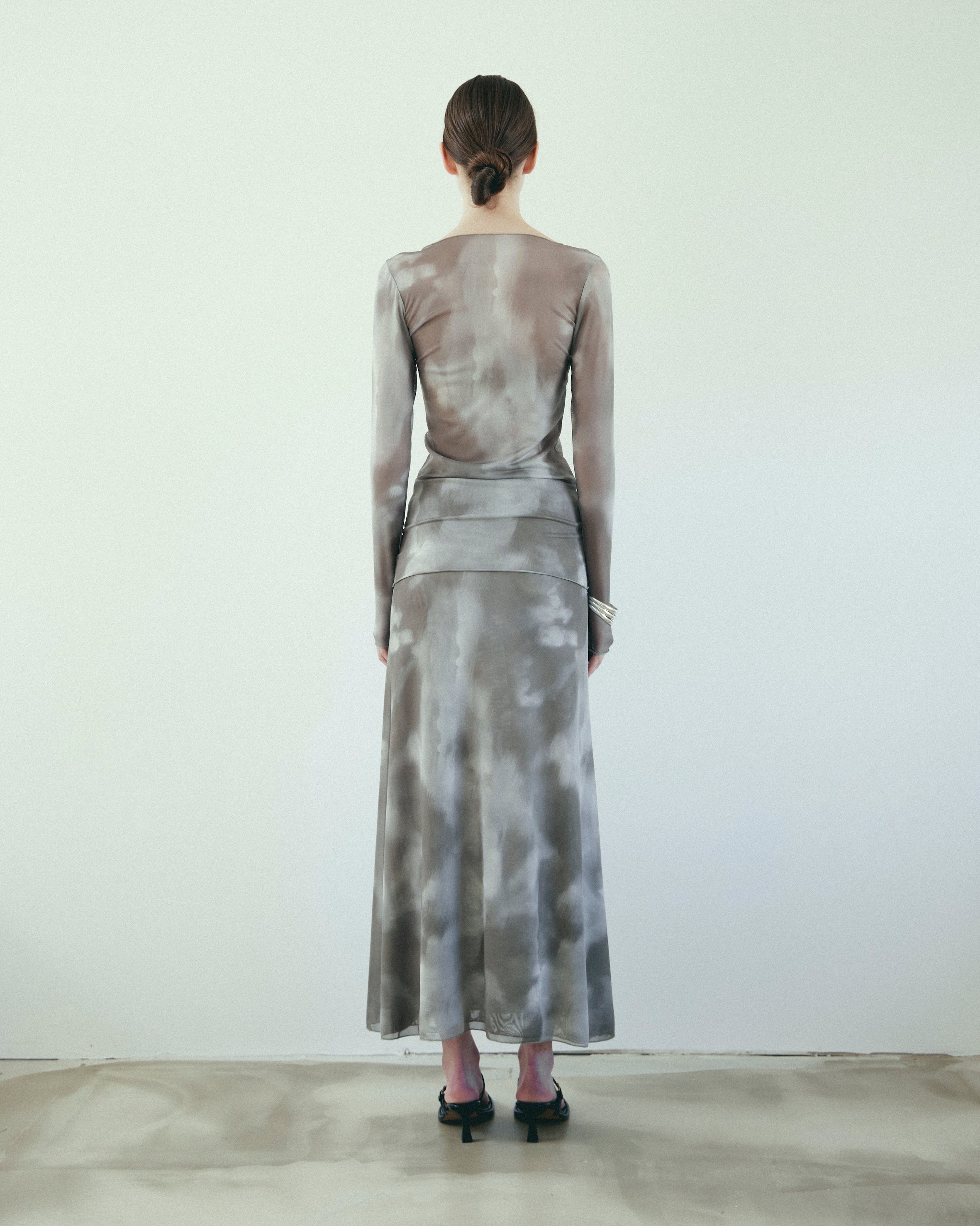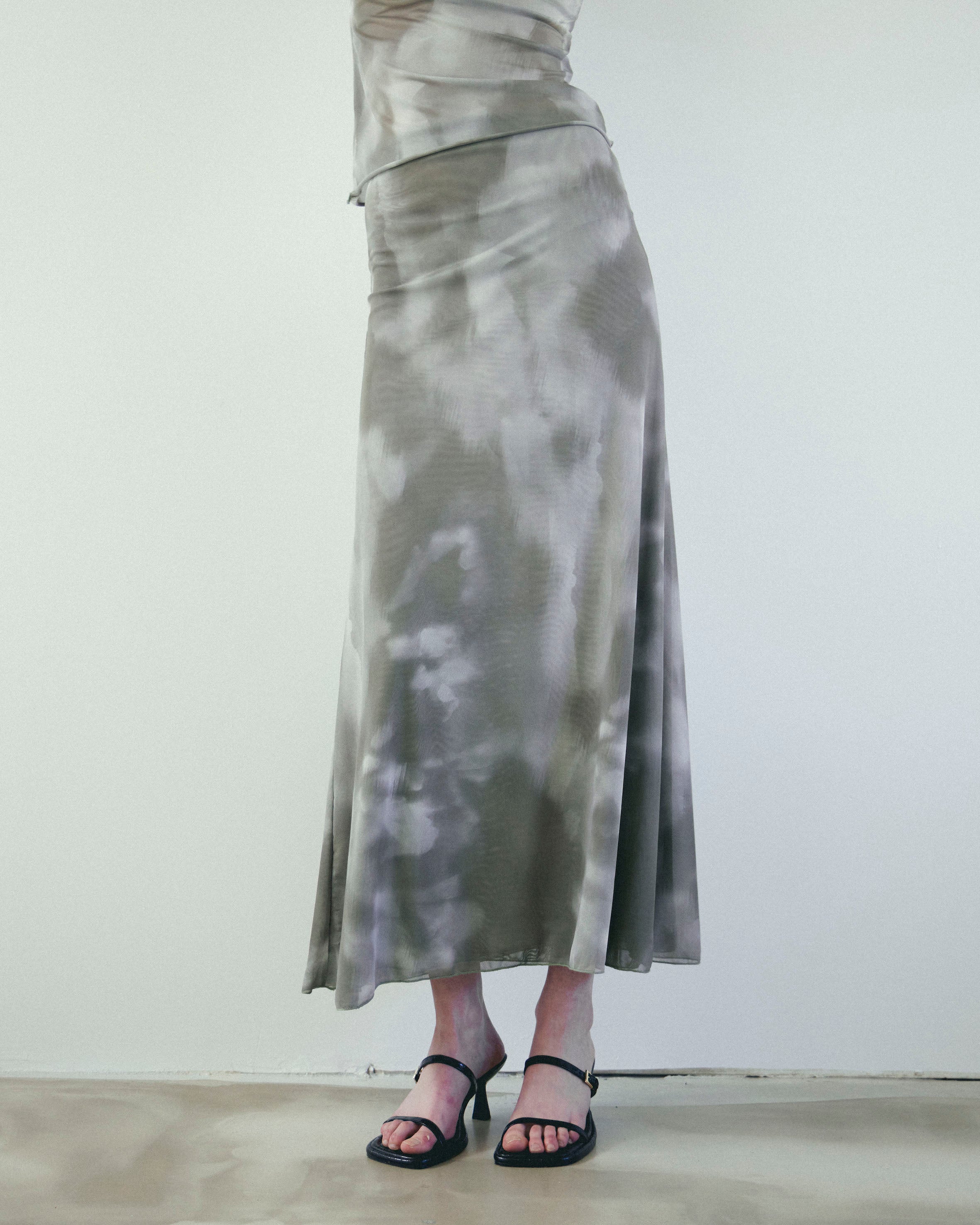The Dune Skirt is a minimalist fitted skirt with a bell hem. It has two layers of mesh, an elasticated waist and baby locked hems for a minimal finish.