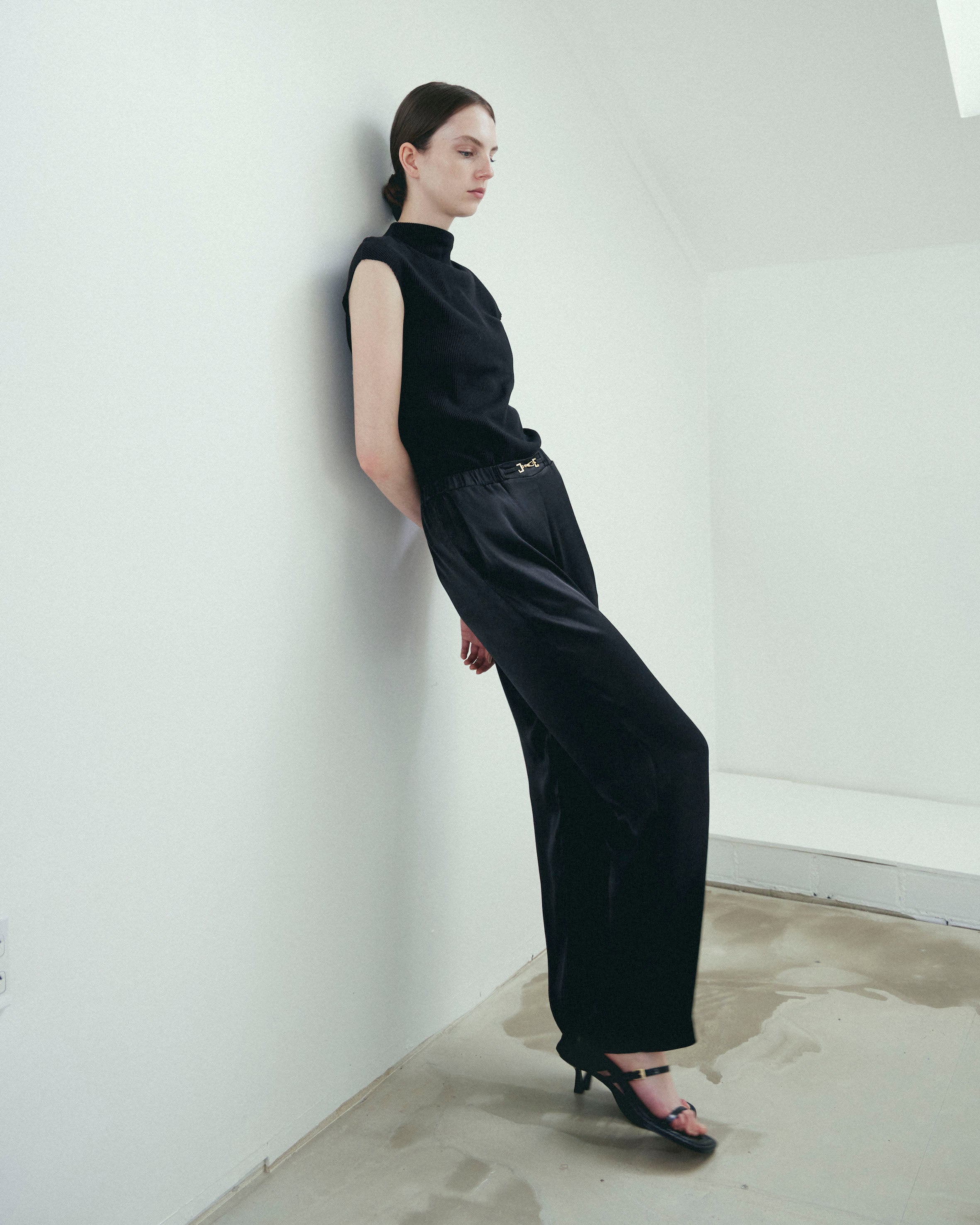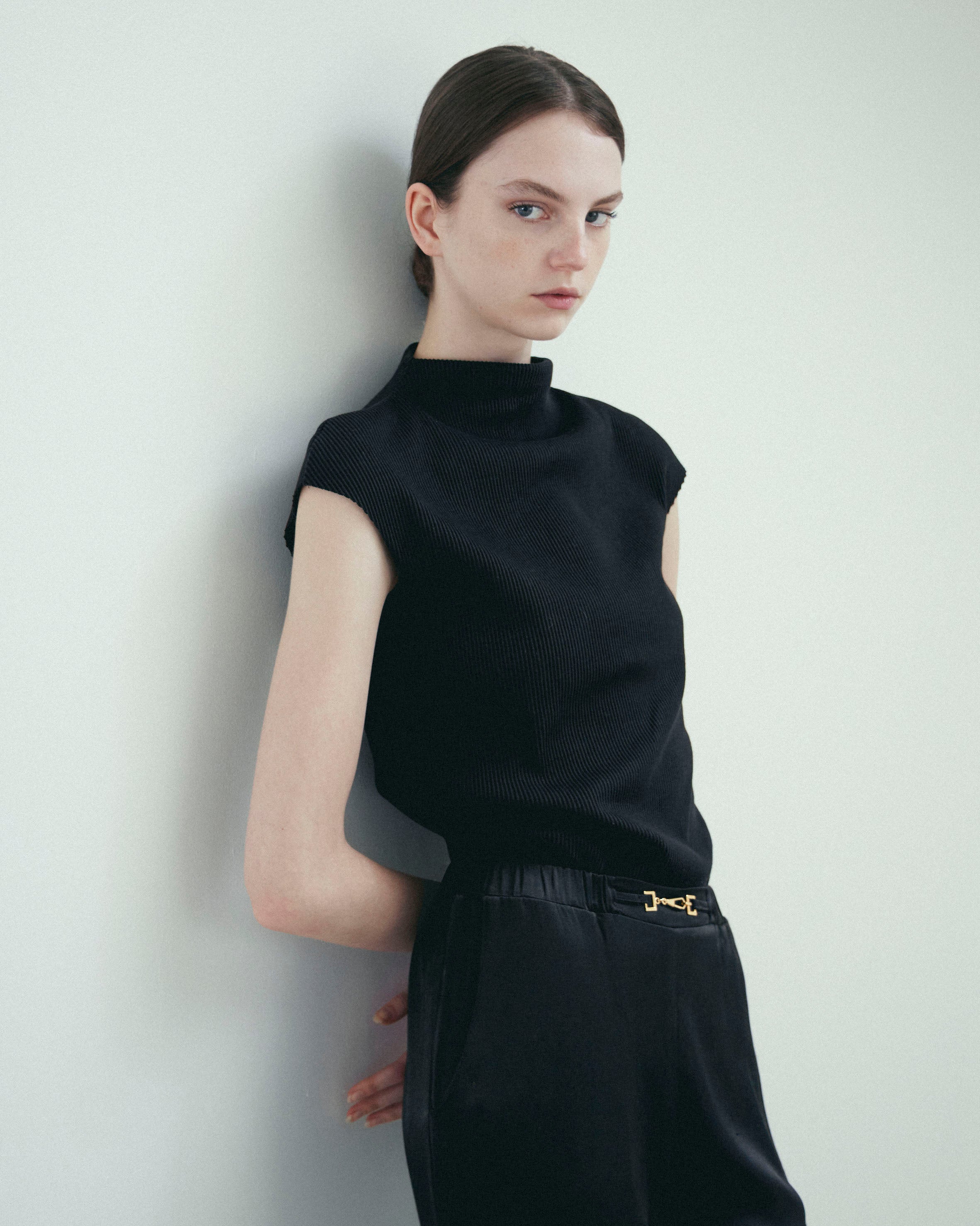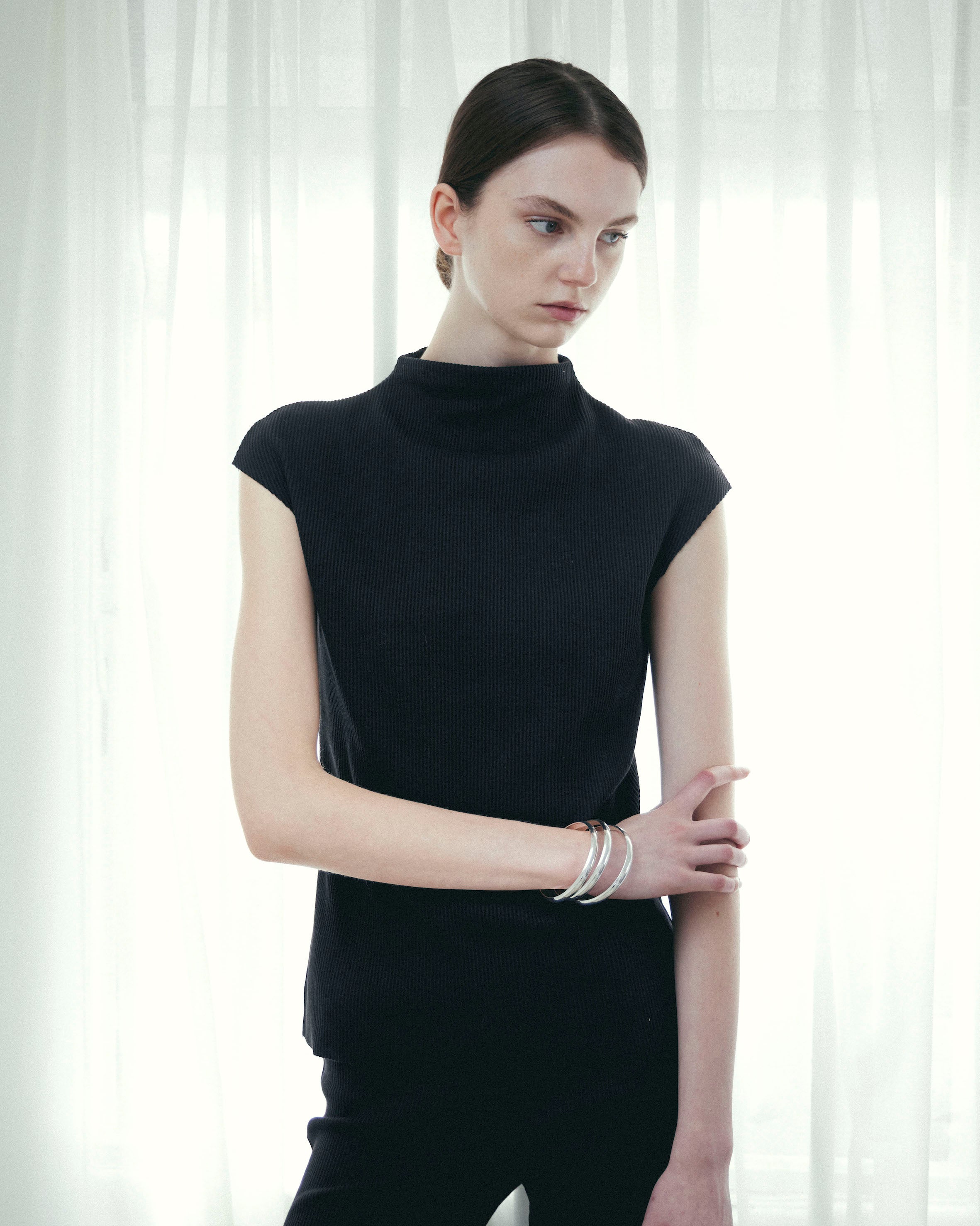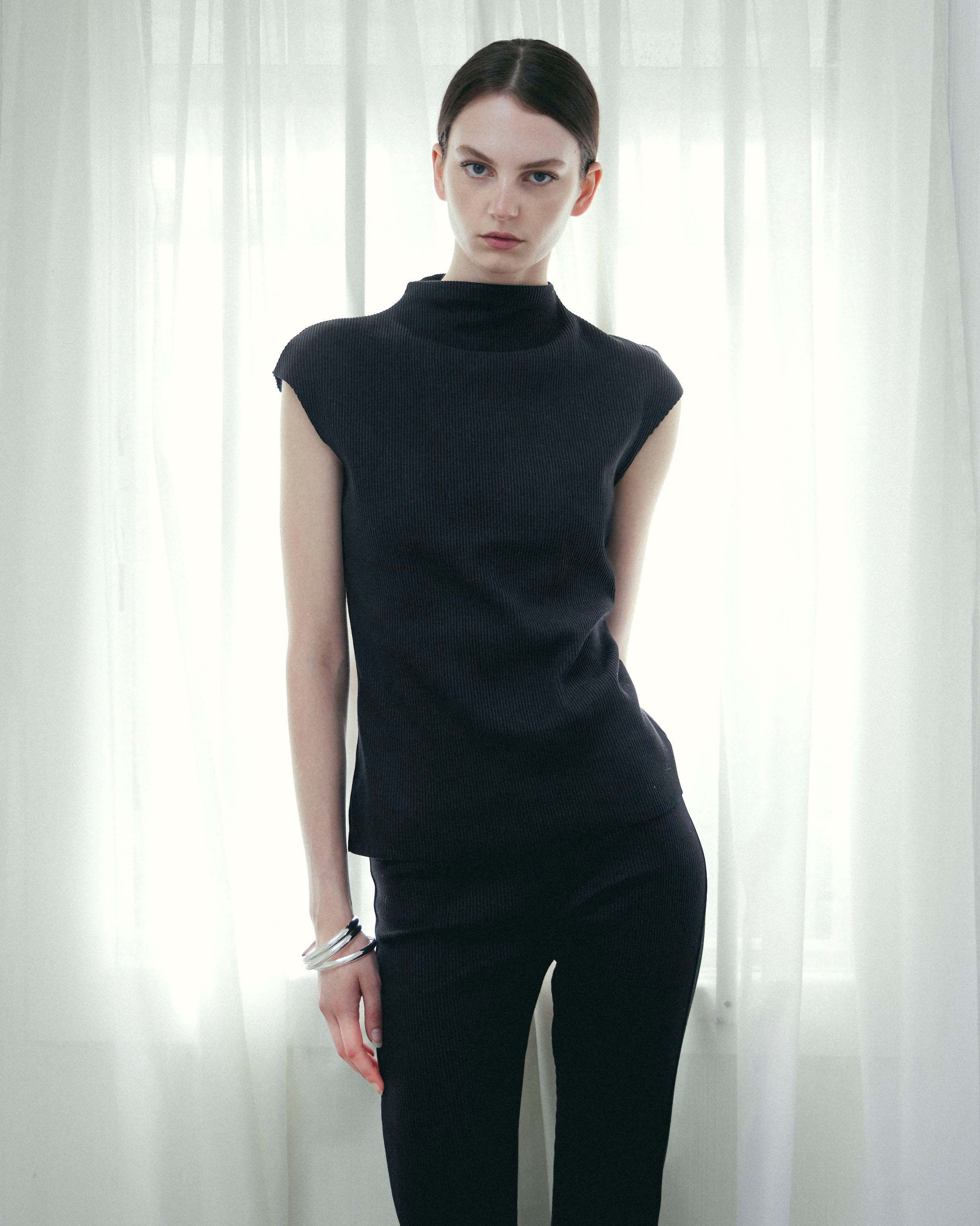 Simple and chic the Io tee is a loose fitting stretch style made in a heavy corded rib. It has a tube neck, capped sleeves and raw hems.